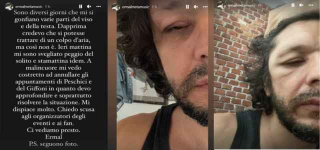 Con una serie di storie pubblicate sul proprio profilo Instagram, Ermal Meta ha annunciato di dover annullare gli impegni pubblici a cui avrebbe dovuto partecipare a causa di un problema di salute. Il cantautore che è tornato in tour dopo lo stop forzato degli ultimi due anni a causa della pandemia, ha spiegato ai fan di avere parti del viso e la testa gonfia. Un problema che ha riscontrato da qualche giorno di cui, però, non conosce ancora la causa.
