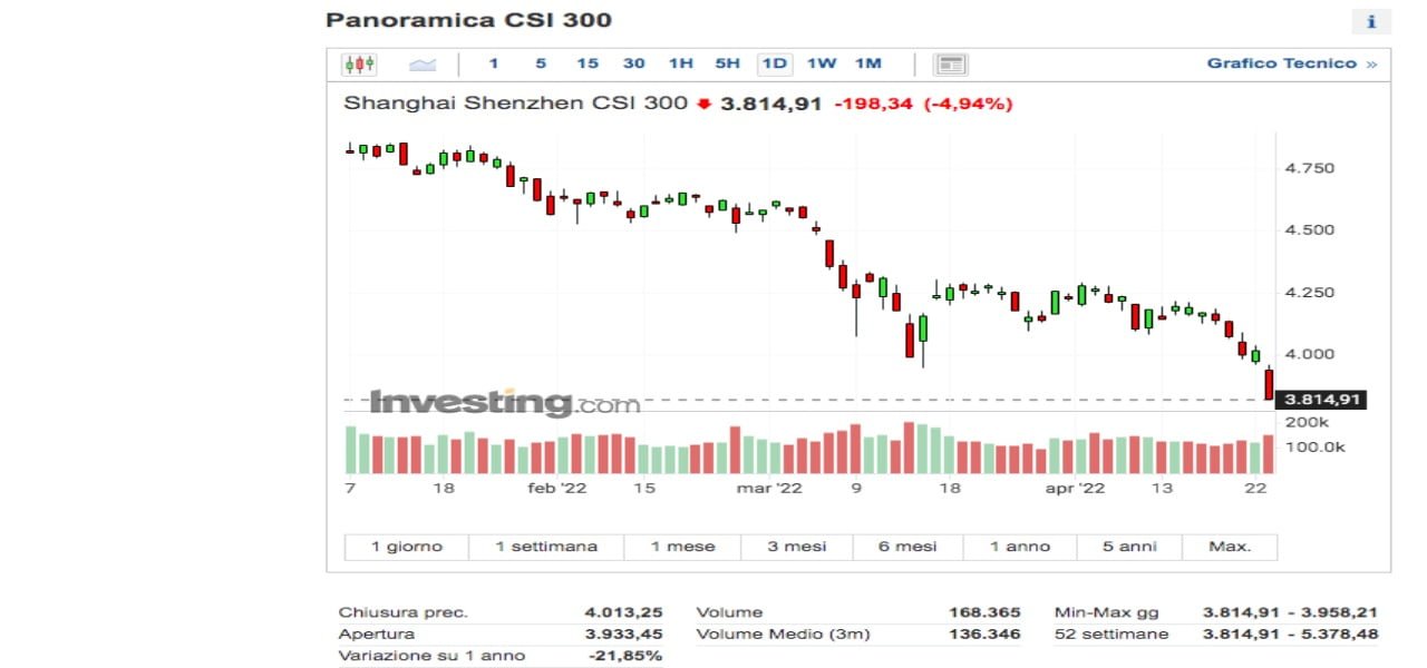 Infatti il 14 febbraio il csi300 aveva aperto 5922 toccando un massimo di 5930 ma dopo il minimo del 25 luglio a 4663 e la conseguente il latte realizzazione, l’indice ha avuto un crollo definitivo dal 12 dicembre 2021 fino ad arrivare al minimo di oggi a 3814.