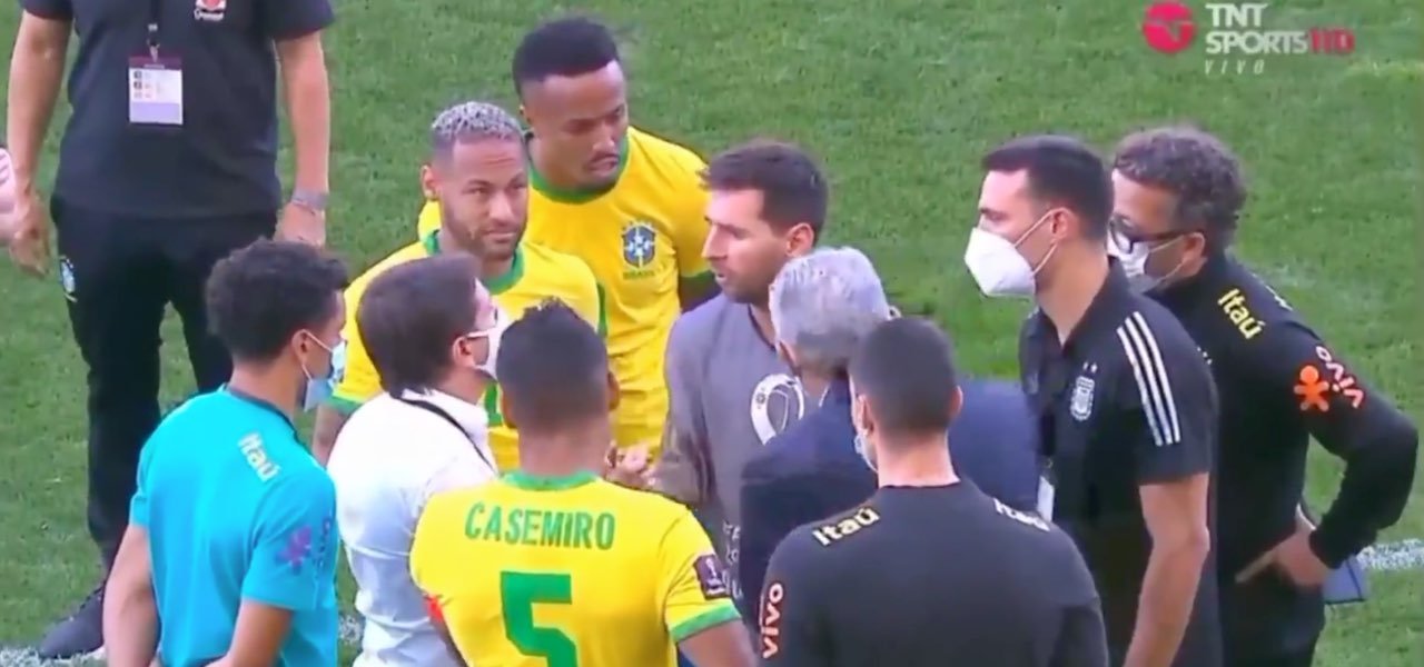 Già prima della partita le autorità avevano fatto irruzione nell’albergo dove alloggiava l’Argentina per far rispettare il protocollo anti Covid. Alla fine ai quattro giocatori è stato dato il permesso di prender parte alla partita dalla Conmebol, la federazione continentale sudamericana di calcio. Nel pomeriggio aveva anche avvisato la federazione brasiliana che se avesse impedito all’Argentina di utilizzare i giocatori tesserati in Premier League gli avrebbe inflitto dei punti di penalizzazione. Di parere diverso le autorità brasiliane che hanno sospeso il match. Quindi, gli argentini sono tornati negli spogliatoi in attesa di nuove disposizioni. Poco dopo, Lionel Messi è tornato in campo, ma senza la maglia dell’Albiceleste, per parlare con gli avversari. Poi è arrivata la notizia ufficiale: la partita è stata sospesa, anche se il Brasile si è mostrato disposto a disputare la partita, infatti Neymar è stato ripreso a colloquio con le autorità sanitaria per cercare di non arrivare alla penalizzazione, ma poi la partita è stata definitivamente sospesa e l’Argentina ha abbandonato lo stadio.