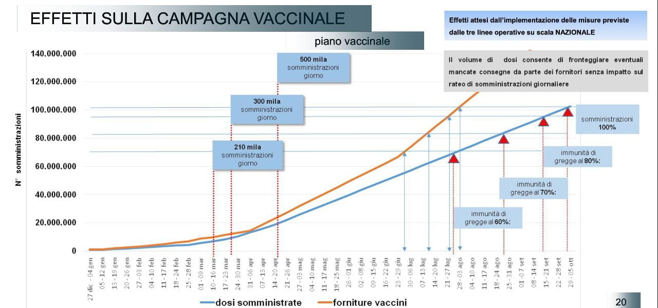 «Triplicare le vaccinazioni giornaliere e ognuno aspetti il proprio turno», questo è il diktat arrivato dal Premier Mario Draghi e così il piano vaccini del generale Figliuolo si struttura seguente questa direttiva. «Ad oggi sono state approvvigionate 7,9 milioni di dosi, che si raddoppieranno entro le prossime tre settimane – si legge nel vasto piano vaccinale diffuso ieri dal portale del Governo (qui testo integrale, ndr) -. Entro la fine di giugno è previsto l’arrivo di altre 52 milioni di dosi circa, mentre ulteriori 84 milioni sono previsti prima dell’autunno».
