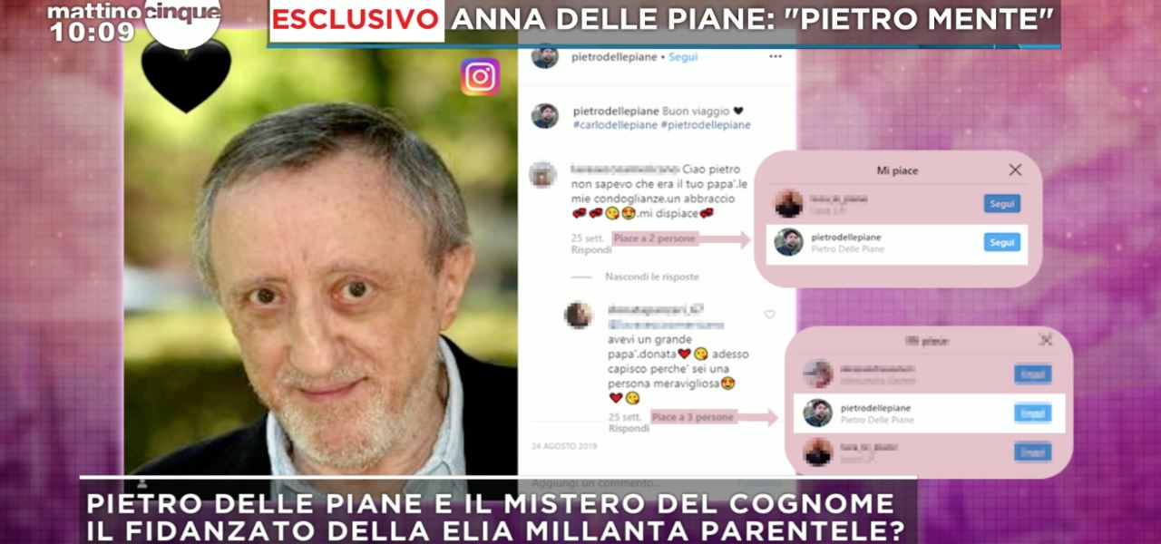Pietro Delle Piane è davvero parente dell’attore Carlo? Il fidanzato di Antonella Elia alimenta nuove polemiche. Nei giorni scorsi Biagio D’Anelli ha affermato che il vero cognome sia Le Piane, ma che si faccia chiamare Delle Piante per millantare una parentela col celebre attore. Allora la vedova Anna Crispino è intervenuta a Mattino Cinque per fare chiarezza sulla vicenda. Interpellata da Federica Panicucci, ha escluso che possa essere un parente stretto di suo marito e di non aver mai visto Pietro Delle Piane in vita sua. La conduttrice ha allora spiegato ai telespettatori cosa è successo. In occasione della morte di Carlo Delle Piane, avvenuta il 23 agosto del 2019, il fidanzato di Antonella Elia ha pubblicato una foto dell’attore con la frase “Buon viaggio”. Tra i commenti sotto al post ce ne sono diversi con cui gli fanno le condoglianze. C’è anche chi ha commentato: “Non sapevo che fosse il tuo papà. Le mie condoglianze, un abbraccio”. Un altro invece: “Avevi un grande papà, adesso capisco perché sei una persona meravigliosa”. A questi Pietro Delle Piane ha lasciato un like, senza quindi preoccuparsi di smentire la parentela.