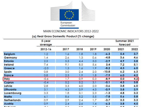 Arriviamo all’Italia. Sempre in sede di Previsioni economiche di estate 2021, la Commissione ha poi aggiornato le sue precedenti stime per i vari Paesi e, anche per la nostra penisola, il dato è positivo perché rivisto al rialzo rispetto alla scorsa primavera: il Pil nel 2021 viene visto in crescita a quota +5% (+4,2% il precedente), mentre per il 2022 si sale “solo” a un +4,2% (anziché +4,4%).