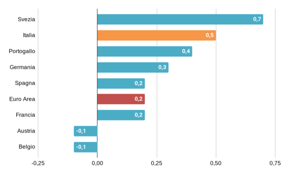 Nello scorso intervento abbiamo commentato positivamente le prime stime Istat sull’andamento del Pil nel terzo trimestre, con incrementi reali dello 0,5% rispetto al trimestre precedente e del 2,6% rispetto allo stesso trimestre dello scorso anno che si sono rivelati migliori rispetto a ogni attesa. Proseguiamo ora nell’analisi con un confronto tra la crescita dell’economia italiana e quella degli altri maggiori Paesi dell’Unione europea e, più in generale, dei Paesi più veloci nel pubblicare le loro stime preliminari. In aggiunta all’Italia al momento disponiamo infatti, grazie a Eurostat, delle stime di crescita del Pil anche di Germania, Francia, Spagna, e, Paesi meno grandi ma non meno veloci, Svezia, Portogallo, Belgio e Austria. Il Grafico 1 mette dunque in ordine decrescente i tassi di variazione del terzo trimestre relativi a questi otto paesi più l’intera Euro Area.