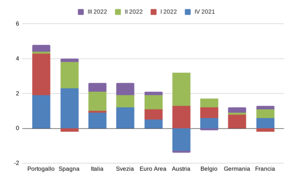 Vediamo così che la crescita maggiore nell’ultimo anno (dal IV trimestre 2021 al III del 2022) si è verificata nei Paesi iberici (Portogallo +4,9% e Spagna +3,8%) seguiti dalla strana coppia Italia e Svezia col 2,6%. Questi quattro Paesi hanno fatto meglio dell’Euro Area (che si è fermata al 2,1%), mentre Austria (1,8%) e Belgio (1,6%), da un lato, e soprattutto Germania (1,1%) e Francia (1%), dall’altro, hanno fatto decisamente peggio. Sorprende vedere le due maggiori economie europee ritrovarsi come fanalino di coda della crescita e sorprende anche, positivamente, ritrovare l’Italia nell’altra metà della classifica. Non sorprendono invece i buoni dati di Portogallo e Spagna, i Paesi le cui economie erano state più colpite dal Covid e che in conseguenza hanno dovuto correre di più per recuperare quella caduta.