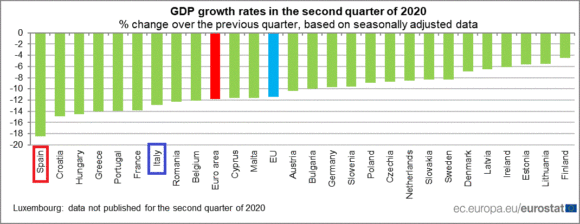 L’insieme di questi dati, oltre a quello già diffuso in tema di occupazione, obbliga la Spagna a insediarsi nelle caselle più lontane delle varie classifiche internazionali. Già in occasione del recente rapporto di Eurostat, lo status spagnolo era quello di fanalino di coda: nel periodo compreso tra aprile e giugno, la flessione del Pil iberico equivaleva a 18,5 punti percentuali rispetto a una media dell’intera Eurozona pari al -11,8%.