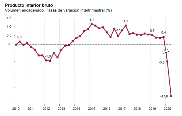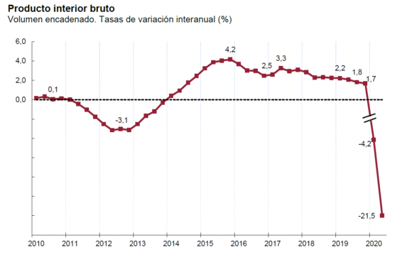 Anche il dato su base annua non fa ben sperare sia per il presente che per l’immediato futuro spagnolo: -21,5% rispetto al -22,1% delle stime. Si tratta di un significativo e vertiginoso crollo rispetto al -4,1% (tendenziale) del primo trimestre.