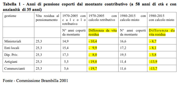 Essendo la tabella del 2001 (in occasione del primo monitoraggio della riforma Dini) non vi erano incluse le modifiche apportate ai requisiti del pensionamento anticipato dalla riforma Fornero, ma è facilmente intuibile che la gran parte dei trattamenti erogati in precedenza abbiano usufruito del beneficio derivante dallo scostamento tra gli anni del montante contributivo e quelli della vita residua al pensionamento. Non si dimentichi che, ancora nel 2010, l’età media di coloro che percepirono il trattamento di anzianità era pari a 58,3 anni se dipendenti, a 59,1 anni se autonomi.