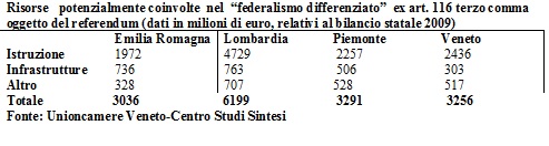 Un chiarimento che ammetterei si potrebbe/dovrebbe legittimamente chiedere alla politica riguarda la sopportabilità dell’ampliamento delle spese coinvolte da parte dei bilanci regionali e come affrontarla. Qui la parola spetta innanzitutto alle cifre, ma la conclusione sarebbe definitivamente lasciata alla politica. In uno studio di qualche tempo fa, precedente la richiesta di referendum da parte delle due Regioni, l’Unioncamere Veneto insieme al (veneto) Centro Studi Sintesi avevano elaborato calcoli sull’ impatto della realizzazione del “federalismo differenziato” derivante dall’applicazione del trasferimento delle funzioni dal centro alla periferia possibile ex art. 116, terzo comma, proprio quello che viene proposto agli elettori a nord del Po. Lo studio prendeva in considerazione, oltre alla Lombardia e al Veneto, anche l’Emilia Romagna e il Piemonte, considerando come materie su cui si concentrerebbe il potenziamento delle competenze regionali: l’istruzione, le infrastrutture regionali, la protezione civile e i beni culturali.