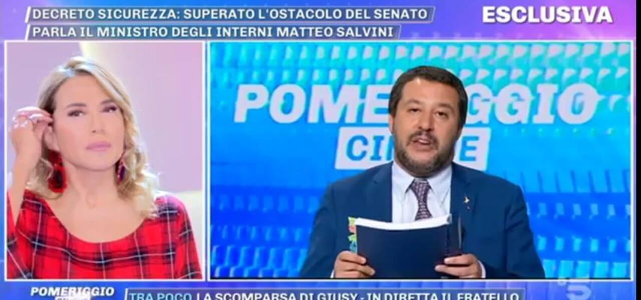 Un Matteo Salvini scatenato quello visto oggi a Pomeriggio 5 in diretta subito il via libera al Senato del “suo” Decreto Sicurezza: il Ministro degli Interni in 10 minuti di “D’Urso-intervista” (la terza negli ultimi 6 mesi) ha illustrato i punti principali del Decreto passato col voto di fiducia anche del Movimento 5 Stelle. «Questo Decreto riguarda la vita di tutti gli italiani che vogliono vivere tranquilli: Fino a ieri si regalavano finti permessi di soggiorno a persone che fino a ieri poi andavano a spacciare, stuprare e far casino. Risparmieremo un po’ di quattrini che utilizzeremo per assumere uomini e donne delle Forze dell’Ordine», spiega Salvini soddisfatto della legge portata a casa (ora passerà alla Camera, ndr) garantendo che non è affatto vero che i permessi di soggiorno verranno eliminati. «Continueremo a tutelare chi scappa davvero dalla guerra, donne, bambini e disabili», spiega ancora il n.1 della Lega che poi passa al contrattacco con il cavallo di battaglia della padrona di casa a Pomeriggio 5, le telecamere negli asili «Andrò fino in fondo per quanto riguarda le telecamere nei luoghi sensibili come asili e case di riposo».