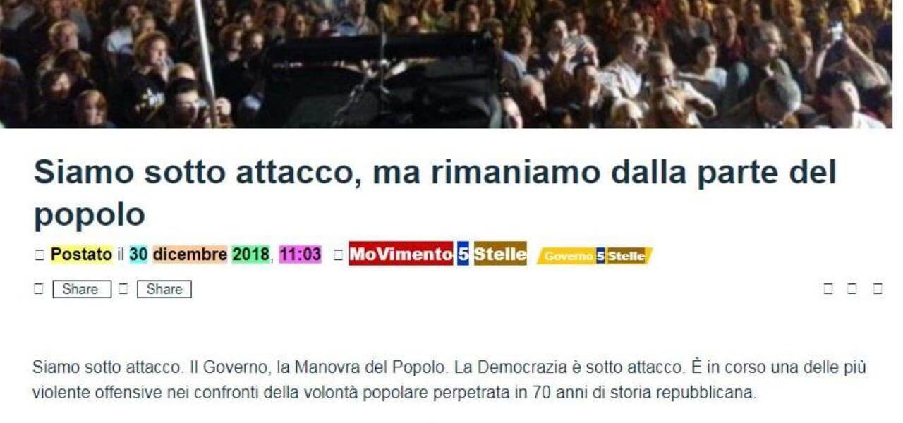 Devono aver pensato di fare il “botto” con un post molto polemico che segue la bagarre in Parlamento durante l’approvazione della Manovra: eppure le menti del Blog delle Stelle (l’unico ufficiale canale di comunicazione politica del M5s) questa volta hanno fatto un vero e proprio passo falso, in “due atti”. Prima la pubblicazione di un post al veleno, «Siamo sotto attacco, ma rimaniamo dalla parte del popolo», poi il caos che ne consegue che porta in poche ore alla rimozione dello stesso da ogni piattaforma online: recuperare il contenuto però non è affatto difficile alle porte del 2019 e così Di Maio & Co. vengono messi in imbarazzo per il contenuto della dura invettiva contro le opposizioni, in particolare Pd e Forza Italia. «E’ in corso una delle più violente offensive nei confronti della volontà popolare perpetrata in 70 anni di storia repubblicana. A sferrarla sono grandi lobby, poteri forti e comitati d’affari. Lottano per sopravvivere, per mantenere i propri privilegi, benefit, prebende, che si sono arbitrariamente assegnati in questi anni sulla pelle degli italiani. Con l’indegna complicità del Pd e di FI, eterni zerbini dei potenti», si leggeva nella prima parte del lungo post a firma Movimento 5 Stelle.