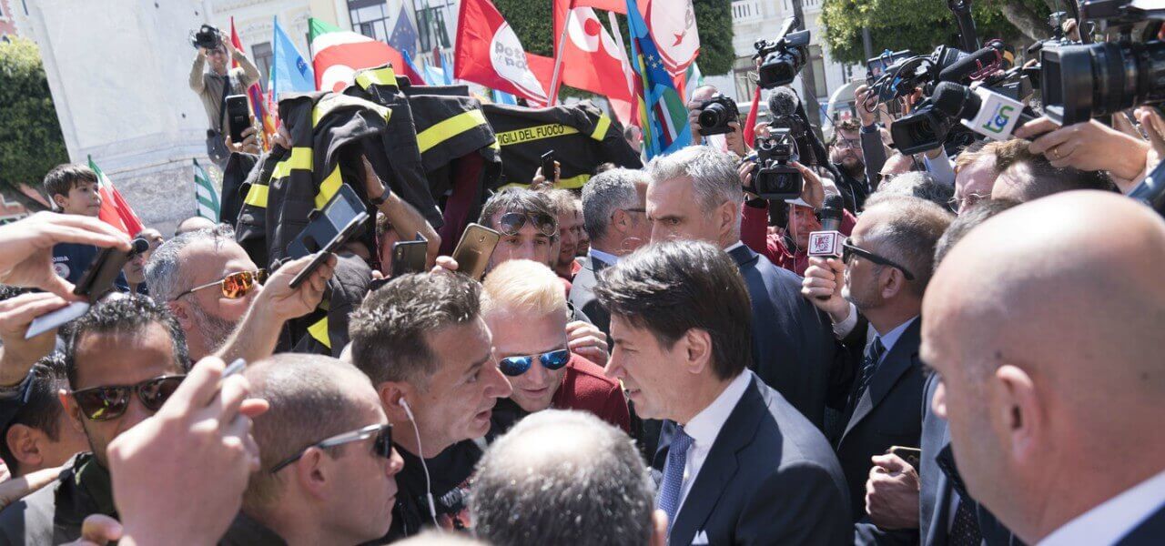 Il premier Giuseppe Conte con i Vigili del fuoco in protesta (LaPresse)