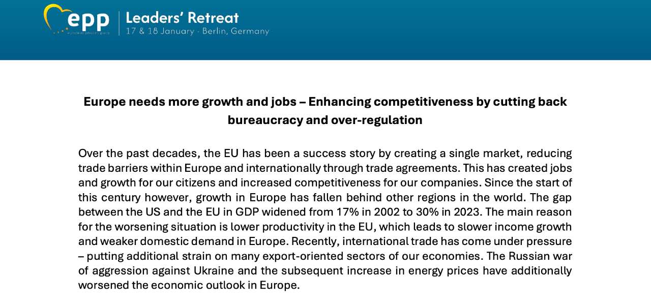 Bisogna cambiare strada. La richiesta del Ppe è di bloccare per due anni le direttive su sostenibilità e rendicontazione, ma si cita anche il dazio sul carbonio alla frontiera (Cbam), perché le pmi vanno esonerate e vanno abbattute le spese per le aziende con oltre mille dipendenti.