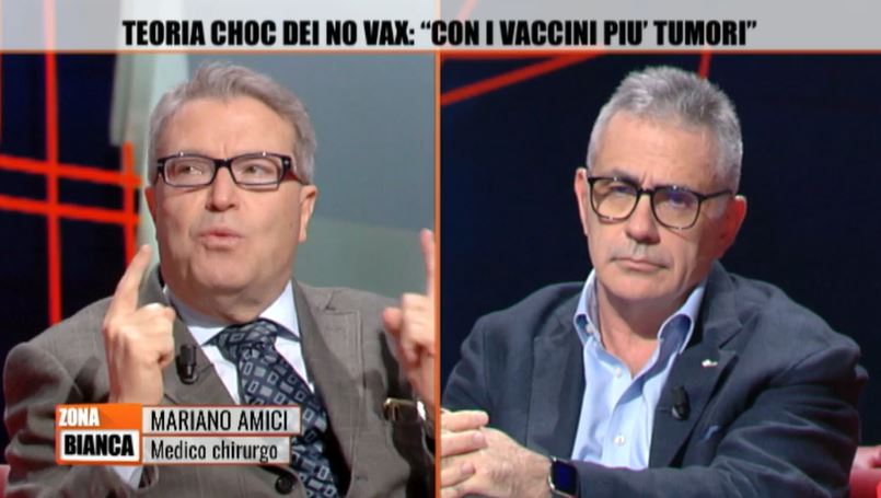 “Buttare lì queste cose – ha proseguito Pregliasco – serve per istillare dubbi nei confronti di quello che è stato un elemento predominante per bloccare la malattia e che credo che in futuro, senza più quegli elementi come obblighi, divieti, green pass, cose che sono state divisive, dovrà e potrà essere raccomandata nelle persone fragili visto che ancora oggi i fragili e gli anziani possono avere degli effetti negativi per il covid”. A quel punto è intervenuto Mariano Amici, noto medico chirurgo no vax che è stato sospeso, ricorda il conduttore Giuseppe Brindisi, che esclama: “I vaccini sono fatti su tessuti di bambini degli anni ’70 nati prematuri. Si usano perchè queste cellule vengono rese mortali e sapete quali sono queste cellule? Quelle tumorali”.