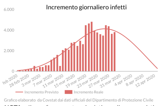 Figura 1: Incremento giornaliero degli infetti. Andamento reale e previsione al 29 marzo. Fonte: Elaborazione http://covstat.it sulla base dei dati ufficiali della Protezione Civile.