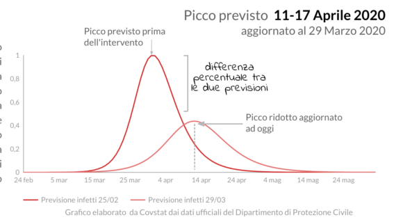 Abbiamo già detto che questa deve essere presa come una buona notizia nonché una conferma dell’efficacia delle procedure di lockdown. Il picco che si sposta in avanti, infatti, da un lato ci consente di attrezzarci meglio alla situazione di emergenza guadagnando tempo per aumentare la capacità di accoglienza del nostro sistema sanitario, dall’altro consente di spalmare lo stesso numero di infetti su di un intervallo di tempo più ampio e di ridurre così il numero massimo di persone contemporaneamente infettate da coronavirus e che si rivolgono presso l’assistenza ospedaliera.