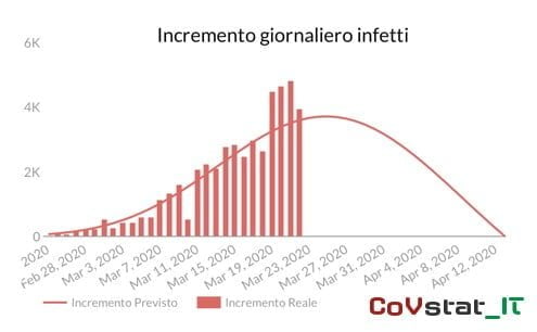 Figura 1: Incremento giornaliero degli infetti. Dati reali e valori previsti