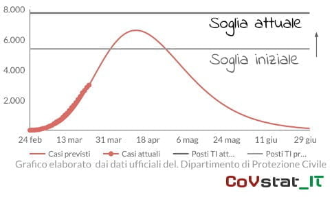 Veniamo alla seconda domanda cruciale alla quale tentiamo di fornire una risposta e cioè se il nostro sistema sanitario sarà in grado di sostenere il gravoso impegno imposto dall’emergenza che stiamo vivendo. In tal senso una variabile cruciale da monitorare (anche se non l’unica) è rappresentata dal numero di pazienti ricoverati in terapia intensiva. Al di là di altre informazioni importanti, infatti, il pericolo oggi è quello di non riuscire a fornire adeguate cure a tutti i pazienti più gravi, con il rischio di un innalzamento della mortalità dovuta al virus.