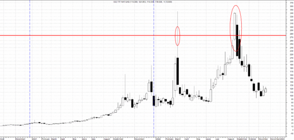 Soffermando l’attenzione all’andamento del prossimo e potenziale benchmark (rif. derivati quotati sul Ttf) è opportuno (e molto significativo) riportare alcuni elementi di riflessione. L’attuale soglia di prezzo a 275 euro risulta in primo luogo assai distante rispetto agli attuali valori; inoltre, l’area di price cap oggetto di proposta non ha mai concluso per due settimane consecutive al di sopra di quest’ultima soglia. Se di vero e proprio “cap” si deve parlare, l’aver identificato un valore solo in funzione dei massimi registrati è alquanto fuorviante sia dal punto di vista statistico che da un più concreto e tangibile riscontro con la quotidianità.