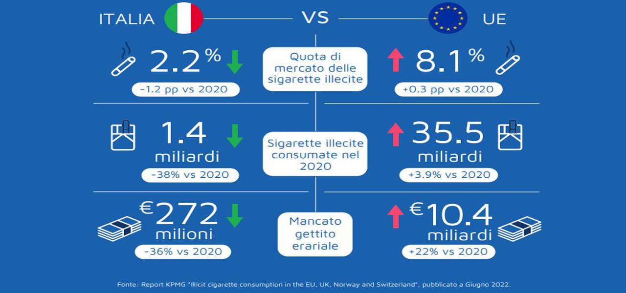 Il rapporto annuale di Kpmg si concentra sul consumo di sigarette di contrabbando in 30 Paesi europei – 27 Stati membri della Ue, più Regno Unito, Norvegia e Svizzera – e mostra che se queste sigarette fossero state acquistate legalmente, i Governi avrebbero incassato 10,4 miliardi di euro di tasse in più. Il report mostra, inoltre, che circa la metà – 16 su 27 – degli Stati membri della Ue registra un calo o una stabilità del consumo di sigarette illecite nel 2021. Tra questi paesi c’è l’Italia che registra un consumo di 1,4 miliardi di sigarette di contrabbando pari al 2,2% nel 2021 mostrando, a testimonianza dell’efficace azione di contrasto e deterrenza svolta dalle forze dell’ordine e dall’Agenzia delle Dogane e dei Monopoli, un calo di 1,2 punti percentuali rispetto al 2020. A livello nazionale il mancato gettito legato al contrabbando è stato di 272 milioni di euro (-36% rispetto al 2020, pari a un recupero di gettito di circa 100 milioni di euro su base annua), grazie all’impegno delle Istituzioni nel contrasto di questo fenomeno. «Siamo convinti che i consumatori debbano essere incentivati a non ricorrere alle sigarette illecite. Garantire la disponibilità e la conoscenza delle alternative senza combustione per quei milioni di fumatori adulti che non smettono dovrebbe essere la nostra priorità comune in Europa», ha concluso Verdeaux.