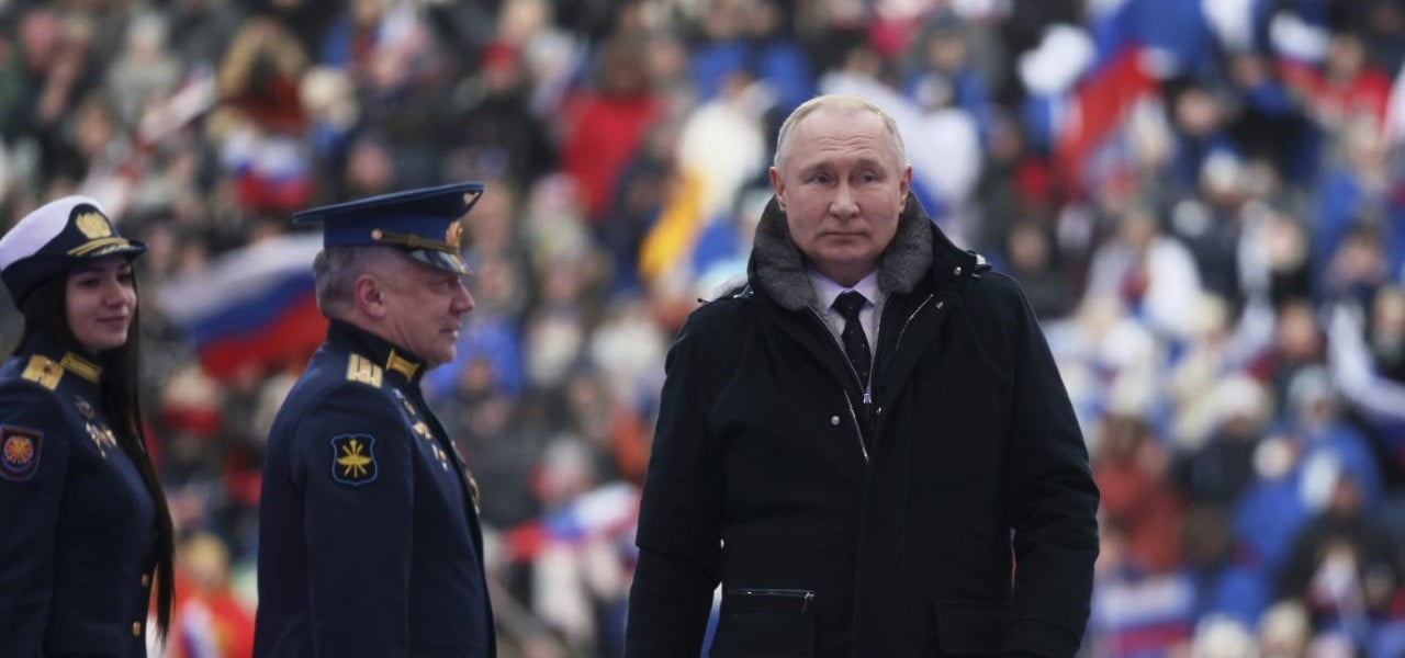 Vladimir Putin ieri al concerto "Gloria ai difensori della patria" (LaPresse)