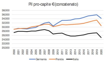 Tra il 2018 e il 2020 l’Italia ha perso l’8% di Pil pro capite, la Francia il 6,7% e la Germania il 3,9%. Se confrontiamo invece il 2020 con il 2010, vediamo che mentre la Germania registra una variazione positiva del 7,4%, e la Francia nulla, in Italia il Pil pro capite è sceso del 7,6%. Se torniamo al 2000, il confronto è ancora più impietoso: Germania +18,7%, Francia +6,1% e Italia -9,3%. Tra l’altro stiamo parlando di Pil pro capite medio, quindi c’è una parte del Paese per cui questa variazione negativa è stata ancora più ampia. Il che ci ricorda la necessità di una ripresa che sia all’insegna dello sviluppo equilibrato.