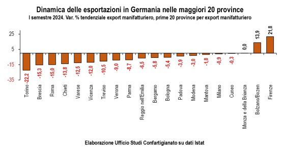 Tra le venti maggiori province esportatrici, si registrano cali a doppia cifra delle vendite sul mercato tedesco a Torino con -22,2%, Brescia con -15,3%, Roma con -15%, Chieti con -13,8%, Varese con -12,5%, Vicenza con -12% e Treviso con -10,5%. Si osserva una tenuta per Monza e Brianza, mentre, in controtendenza, registrano un aumento Bolzano con +13,9% e Firenze con +21,8%.