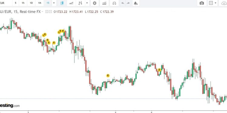 Prosegue il ribasso strutturato dell’oro che nella giornata di oggi ha aperto a 1726 euro l’oncia. Nonostante la risalita delle prime ore alle 5 ha avuto il primo crollo perdendo circa 10 euro del suo valore e arrivando al primo minimo giornaliero di 1722,10 seguito immediatamente dopo dal secondo minimo giornaliero alle ore 11.00 di 1722,03 nonostante l’apparente recupero che ha portato al massimo giornaliero di 1732 euro, la quotazione dell’oro è immediatamente tornata a disegnare nuovi minimi, alle ore 19.00 infatti il minimo è stato di 1720,88 euro.