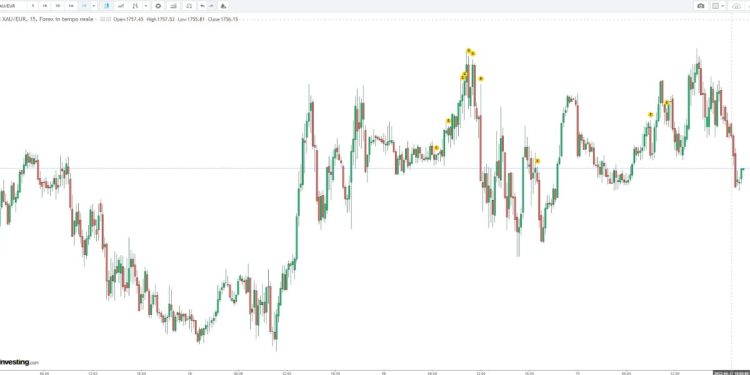 L’oro nel mercato spot dell’euro ha aperto la giornata a 1751 euro, toccando come minimo giornaliero alle ore 1.00 del mattino i 1733 euro l’oncia. A questo minimo è seguito il secondo che costituisce il minimo giornaliero a 1748 euro l’oncia. L’oro a quel punto ha cominciato a risalire segnando 4 colonne orarie verdi fino a raggiungere il massimo giornaliero di 1761 l’oncia per poi ritracciare immediatamente.