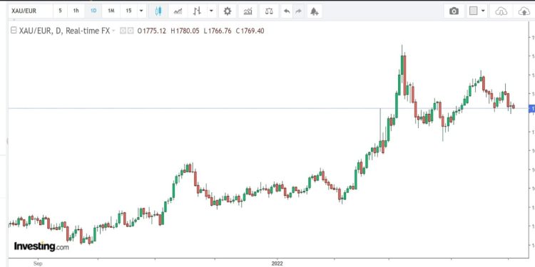 Con l’inasprimento del conflitto russo-ucraino, lo scambio del metallo prezioso con le valute principali era incrementato fortemente raggiungendo 1902 euro, dai 1412 euro l’oncia il 7 marzo 2022. Si è delineato un trend rialzista che tuttavia non è durato a lungo: lo scambio oro-euro ha trovato infatti un nuovo minimo annuale il 29 marzo sui 1698 euro l’oncia. Dal 18 aprile invece, sfondati i 1800 euro di supporto, il prezzo è precipitato e ha aperto una nuova stagione al ribasso che sta attualmente proseguendo.