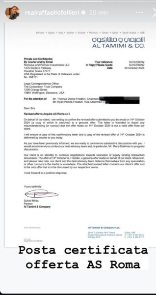Raffaello Follieri ha pubblicato su Instagram il documento ufficiale che certifica la sua offerta ai Friedkin per acquistare l'As Roma.