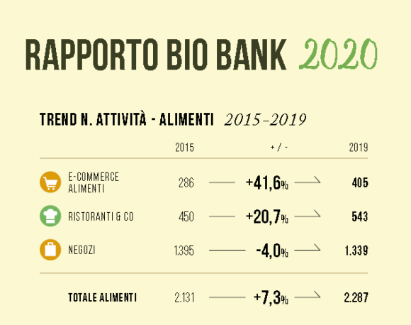 L’espansione dei consumi biologici ha influito anche sulla crescita delle aziende impegnate in produzioni green. E anche qui la conferma viene dai dati. Nell’arco degli ultimi cinque anni, il numero delle attività delle tipologie alimentari censite da Bio Bank è stato protagonista di un’accelerazione del 7,3%. Brillante, in particolare, è risultata la performance dei siti di e-commerce di alimenti bio, arrivati a quota 405 unità sulla scorta di un aumento del +41,6%, spia di un trend già positivo, peraltro ora accelerato dalla pandemia. Bene però hanno fatto anche i ristoranti bio, che con 543 locali censiti macinano uno sviluppo del +20,7%, purtroppo difficilmente destinato a trovare conferma nel 2020 a causa delle chiusure forzate imposte dalle misure di contenimento della pandemia. Note meno positive arrivano invece dai negozi bio che calano del 4%, non superando la soglia di 1.339 unità: qui a farsi sentire è la concorrenza della grande distribuzione alla quale i punti di vendita al dettaglio reagiscono puntando sull’aggregazione.