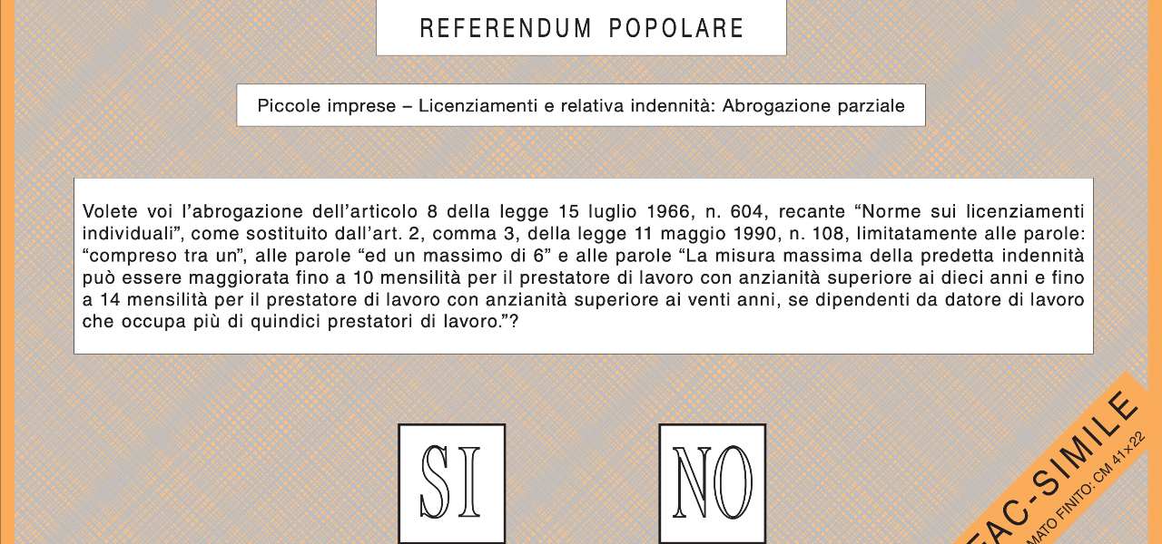 Venendo a noi, il secondo quesito referendario è — appunto — quello relativo ai licenziamenti nelle piccole imprese, e mira a modificare parzialmente l’articolo 8 della legge numero 604 del 15 luglio 1966 e la successiva modifica della legge 108 dell’11 maggio 1990: l’argomento è relativo ai licenziamenti per ingiusta causa nelle imprese che hanno meno di 15 dipendenti e, soprattutto, al risarcimento riconosciuto al lavoratore ingiustamente licenziato.