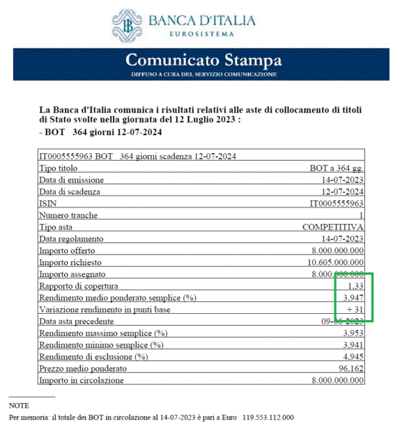 Tralasciando questa iniziale, prolissa e intera premessa, la sopracitata percentuale è stata assegnata ieri. Un +3,947% (ovviamente lordo) per un ammontare complessivo pari a 8 miliardi di euro a fronte di un importo richiesto di oltre 10,6 miliardi. Tutto questo al termine dell’asta in capo alla nuova emissione del Bot annuale con scadenza 12 luglio 2024.