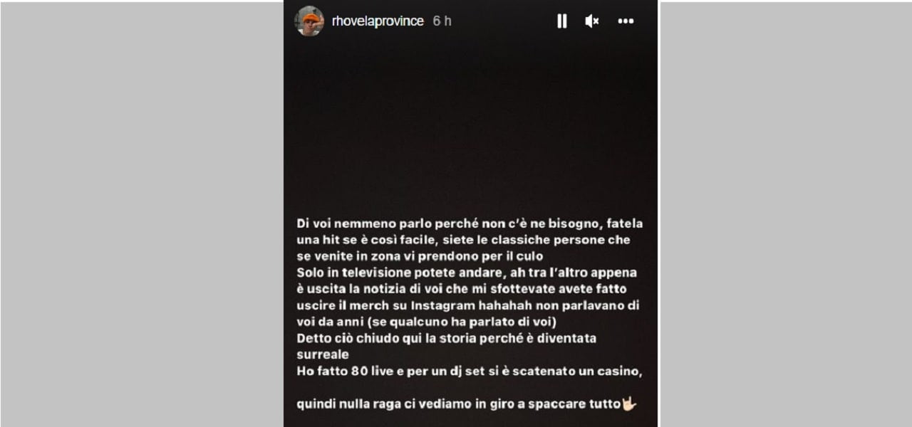 Parole condivise tra le storie di Instagram e che Rhove ha pubblicato nel giorno in cui canterà sul palco del Tim Summer Hits 2022 dove, essendo registrato, non ci sarà alcun accenno all’accaduto.