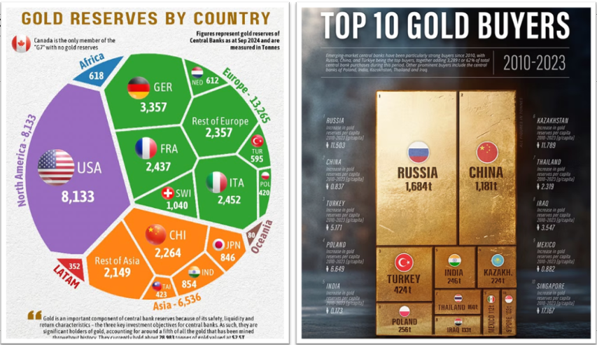 Il primo elemento è molto visibile poiché negli ultimi tre anni c’è stato un record di domanda di lingotti da parte delle Banche centrali: 1.050 tonnellate medie all’anno che fanno il 20% della domanda totale di oro. Tutta questa domanda viene da Paesi come Cina, India, Russia, Turchia, Arabia Saudita, Paesi emergenti che hanno un peso di oro sul totale delle loro riserve ancora troppo basso (in media un quinto di quello dei Paesi sviluppati, Italia compresa).