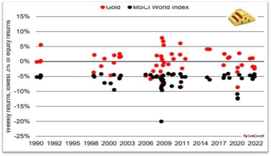 Fra l’altro i mercati azionari sono vicini ai massimi dopo un bull market durato 15 anni e sappiamo molto bene come ogni volta che ci sono delle correzioni importanti su di essi il metallo giallo performi in media molto bene, come vi mostra il grafico di Unicredit Research rielaborato da Banca Patrimoni Sella & C.