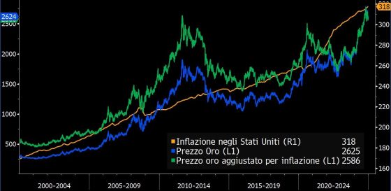 Dal 2000 a oggi, e anche nei secoli precedenti, ha seguito in qualche modo l’andamento dell’inflazione (americana quella rappresentata in questo caso), pur con momenti di scostamento temporanei anche importanti.
