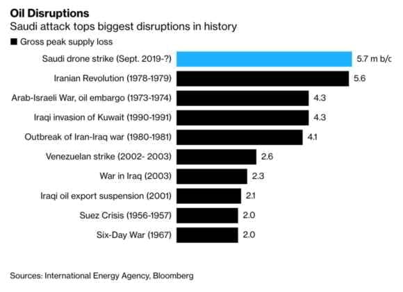 Prima riflessione: che l’entità dell’attacco sia reale o meno, difficilmente guerriglieri duri e irriducibili ma grezzi e con mezzi poco sofisticati come gli Houthi potrebbero portare a termine un attacco simile. Seconda e più importante, comunque sia, penso che dopo un precedente simile, Ryad stanzierà – fra il giubilo dei suoi cittadini, in molti casi alla fame – qualche bel centinaio di miliardi di dollari in investimenti (invece che in welfare) per la futura difesa dei proprio “oro nero”: e, a vostro modo di vedere, chi fornirà tecnologia e armamenti all’Arabia Saudita? Bravi. Terza riflessione, qualcosa non torna, visto che a fronte di danni ufficiali come quelli riportati dalla tabella di Bloomberg, le autorità saudite si sono dette in grado di far ripartire un terzo della produzione totale a sole 48 ore dall’attacco. O non è andata esattamente come ci dicono le cronache ufficiali o millantano, tertium non datur. Ma poco importa, perché il petrolio che nei primi trades asiatici prende il 19% a livello di prezzo, massimo balzo intraday dal 1991, dopo trimestri e trimestri di stagnazione, è manna. Per tutti.