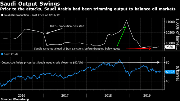 Per gli Usa i quali hanno sì superato Arabia Saudita e Russia come primo esportatore al mondo grazie alla rivoluzione shale oil, ma, sempre con riferimento alla nuova tecnologia, cominciavano a patire non poco l’indebitamento del settore a fronte di prezzo del barile che non saliva. Ora, invece, non solo si può respirare, ma l’eventuale ricorso alle riserve strategiche, come ipotizzato da Donald Trump, apre nuovo spazio produttivo, un qualcosa di assolutamente insperato. Ma anche la stessa Ryad gode, poiché come mostra questo grafico, nonostante abbia limato in rialzo e poi al ribasso la propria produzione per cercare di stabilizzarsi con i trend di mercato pre e post-sanzioni all’Iran, il deficit fiscale saudita necessita di greggio almeno a 80 dollari al barile per raggiungere un break-even accettabile. E, soprattutto, ora che si è tornati a parlare di privatizzazione di Aramco, il gigante statale dell’energia, la madre di tutte le Ipo: e chi pensate che ne curerà la quotazione in Borsa, agendo da sottoscrittore?