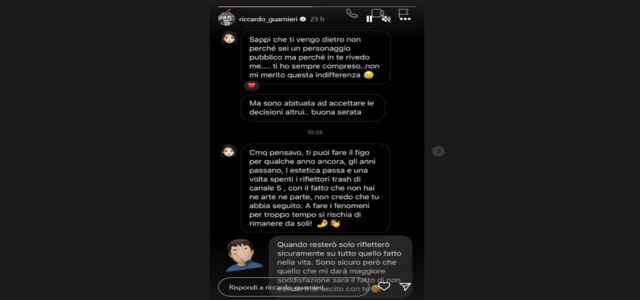 Stando alle parole dell’utente, Riccardo avrebbe delle pretese che, con il tempo che passa, dovrebbe rivedere se non vuole correre il rischio di restare solo. Parole a cui, naturalmente, il cavaliere pugliese ha replicato.