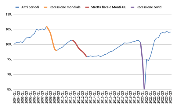 – la grande recessione mondiale del 2008-09 fece cadere il Pil reale dell’Italia complessivamente del 7,7% in 5 trimestri, tra il secondo del 2008 e il terzo del 2009, tuttavia nei successivi 8 trimestri quasi metà di questa caduta risultava recuperata;