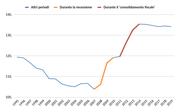 – La recessione del 2008-09 aveva interrotto la precedente fase di discesa del rapporto debito/Pil che era iniziata durante il governo tecnico Dini nel 1995 e si era rafforzata con l’adesione alla moneta unica. Per effetto della recessione e di politiche fiscali ovviamente espansive, ma comunque molto prudenti, il rapporto debito/Pil era risalito dal 104% scarso del 2007 al 119% del 2010, praticamente lo stesso livello di quello di metà degli anni ’90.