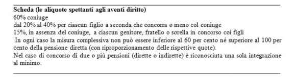 La legge n. 335 del 1995 ha introdotto delle nuove disposizioni che si applicano interamente alle pensioni liquidate dopo l’entrata in vigore della legge suddetta. Per quelle in essere (alla data del 31 agosto 1995) fu prevista la conservazione del trattamento più favorevole, con riassorbimento dei futuri miglioramenti. Se il beneficiario appartiene a un nucleo dove non vi siano altri possibili titolari del diritto, la pensione è corrisposta in misura ridotta pari: al 75 per cento in presenza di un reddito superiore a 3 volte il trattamento minimo; al 60 per cento in presenza di un reddito superiore a 4 volte il trattamento minimo; al 50 per cento in presenza di un reddito superiore a 5 volte il minimo.