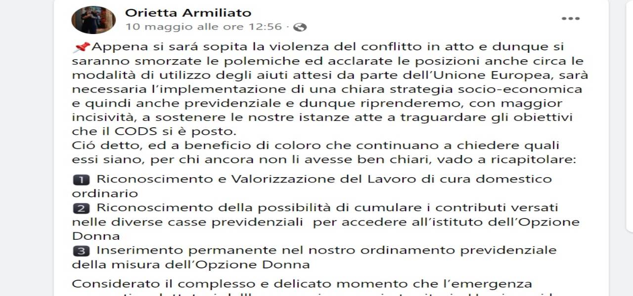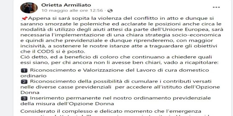 L’attivista ha chiarito in un post su facebook che sarà necessaria una strategia socio-economica e quindi anche previdenziale non appena saranno terminati i conflitti in atto.