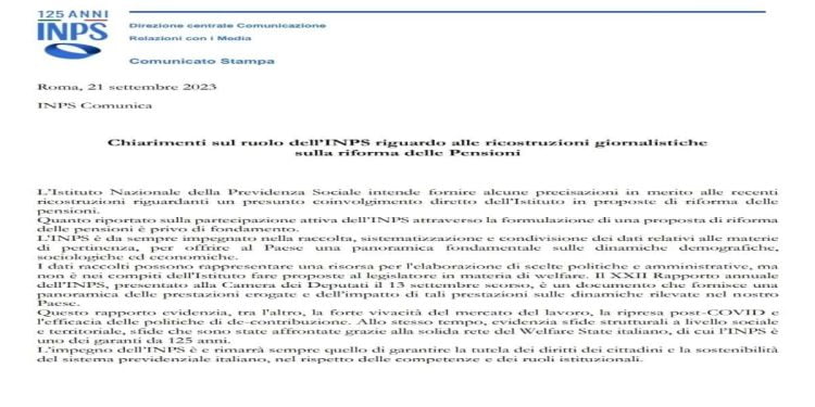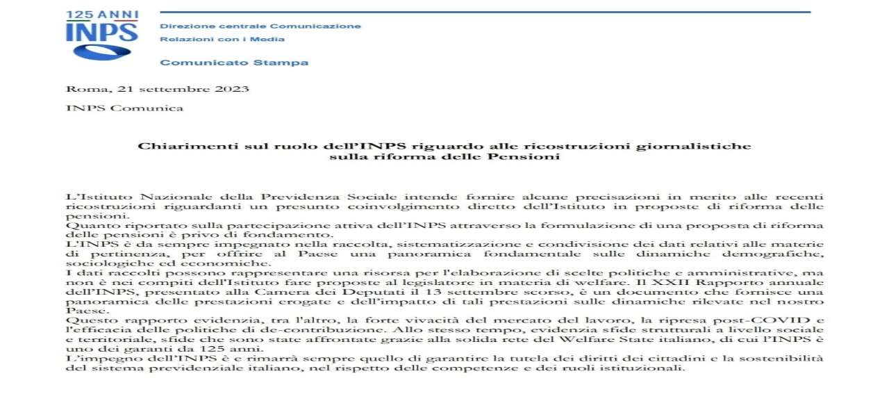 “L’Istituto Nazionale della Previdenza Sociale intende fornire alcune precisazioni in merito alle recenti ricostruzioni riguardanti un presunto coinvolgimento diretto dell’Istituto in proposte di riforma delle pensioni.