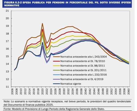 Se vi è un settore che meriterebbe di essere ignorato (salvo alcuni accorgimenti collaterali di cui parleremo in seguito) è quello delle pensioni. La Legge di bilancio per il 2025 è riuscita a recuperare dalle macerie degli anni precedenti un caposaldo della riforma Fornero che è una garanzia per la tenuta del sistema: mi riferisco all’aggancio automatico con cadenza biennale degli incrementi dell’attesa di vita ai requisiti anagrafici e contributivi del pensionamento. Il grafico sottostante mette in evidenza come la normativa vigente, incluso l’aggancio automatico, preveda un picco intorno al 2040 per poi discendere a livelli più sostenibili.