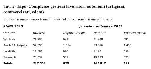 Questa divaricazione tra i comparti vecchiaia e anzianità è più visibile nel caso dei flussi delle gestioni dei lavoratori autonomi (tab. 2), dove, a fronte di una sostanziale invarianza delle pensioni anticipate, si assiste a un vero e proprio dimezzamento di quelle di vecchiaia e di invalidità, per le ragioni esposte sopra. Da notare che i trattamenti di anzianità vantano un importo medio sostanzialmente pari al doppio di quello della vecchiaia, proprio perché gli interessati sono in grado di far valere storie lavorative più lunghe e continuative.
