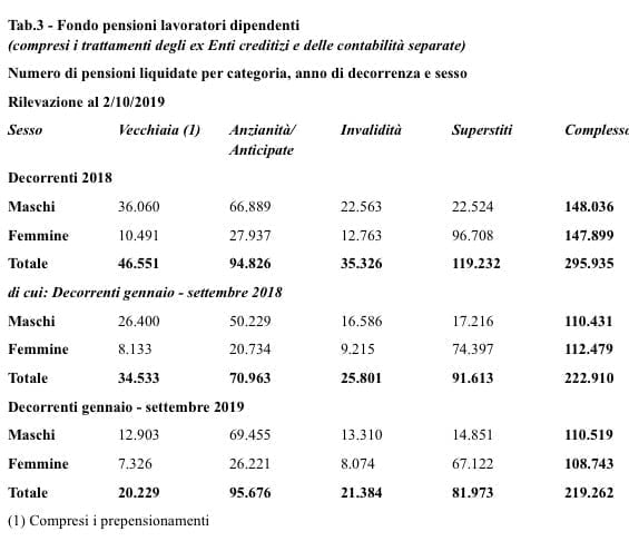 RIFORMA PENSIONI E QUOTA 100: A CHE PUNTO SIAMO? Dal monitoraggio del Coordinamento statistico attuariale dell’Inps (con rilevazioni al 2 ottobre scorso) si possono ricavare alcune indicazioni (tab.1) sugli effetti delle misure contenute nel decreto n. 4/2019 che ha dato corso, oltre al RdC, all’applicazione di Quota 100 e del blocco dei requisiti (42 anni e 10 mesi per gli uomini, un anno in meno per le donne fino al 2026) per il pensionamento ordinario di anzianità a prescindere dall’età anagrafica. I dati riguardano tutte le gestioni private (non si capisce perché non rientrano nei monitoraggi periodici anche i trattamenti pubblici dopo ben sette anni trascorsi dall’incorporazione dell’Inpdap) e mettono a confronto gli esiti del 2018 con quelli dei primi tre trimestri del 2019.