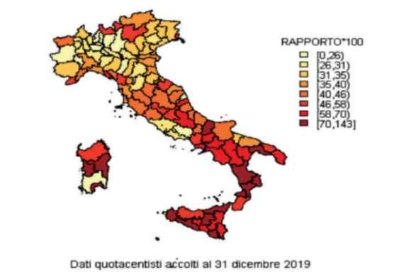 La Lombardia e il Piemonte risultano le regioni con la maggiore componente privata (rispettivamente 82% e 80%), e la Calabria e la Sicilia quelle con il valore più basso (56% la prima e 60% la seconda). Per quanto riguarda la maggiore presenza femminile, il primo posto è occupato dalla Valle d’Aosta, seguita dalla Calabria (rispettivamente con il 31% e il 30% di donne), e nelle ultime posizioni si collocano la Lombardia con il 21% di donne e la Puglia, il Lazio e la Campania con il 23%. La differenza tra la quota di pensionati provenienti dalle gestioni pubbliche rispetto a quelle di tipo privato, si può osservare analizzando il rapporto di coesistenza tra la numerosità dei pensionati pubblici e quelli privati a livello provinciale. Il valore medio nazionale di questo rapporto è 0,39 e, come si evidenza nella successiva figura i valori più elevati sono maggiormente presenti nelle province del Centro e del Mezzogiorno.