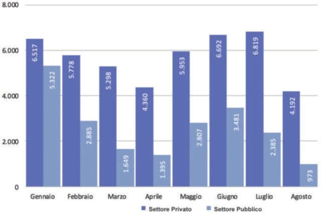 Considerando infine le domande di pensione “Quota 100” pervenute, al netto delle respinte, nel 2020 da gennaio ad agosto si sottolinea che la crisi epidemiologica di inizio anno non ha evidenziato una scelta dei lavoratori più anziani ad anticipare l’uscita dal mondo del lavoro; infatti in questi mesi di crisi non si registrano variazioni sostanziali del trend delle domande di pensioni “Quota 100”. Dopo i primi mesi del 2019 in cui si è assistito a una richiesta più forte di esse, dovuta alla presenza di varie generazioni di soggetti che maturavano i requisiti, le domande si possono considerare stabili e anche per il 2020 si conferma l’utilizzo parziale degli aventi diritto come accaduto nell’anno 2019.